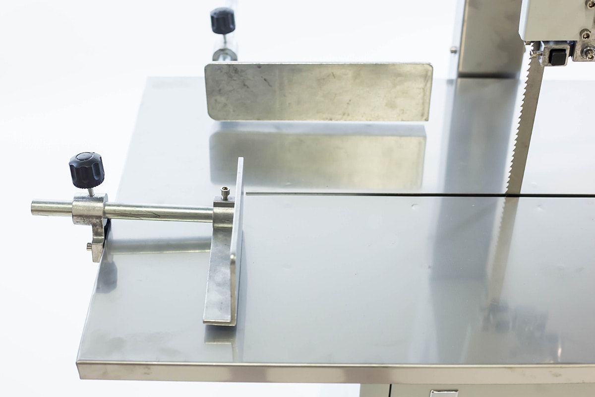 Saghøyden er justerbar for å passe alle størrelser. Det skyvbare rustfrie bordet flyttes lett og ledig på rullelager og er utstyrt med to justerbare stoppere for å gjøre det lettere å lage konstant og lik tykkelse på delene.