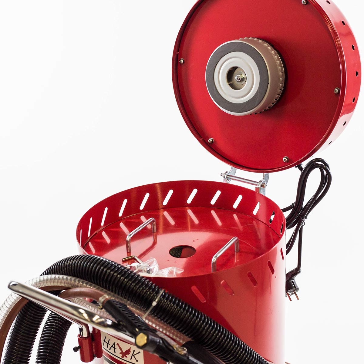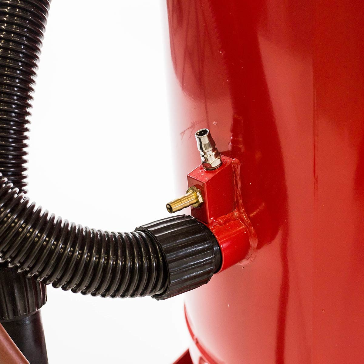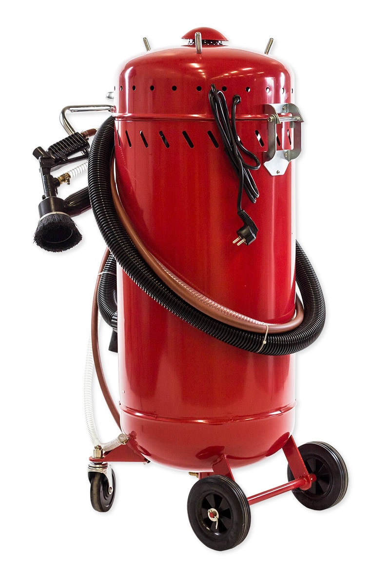 Blåseaggregat med innebygget sug for resirkulering. Egnet for mindre sandblåsejobber både innendørs og utendørs.