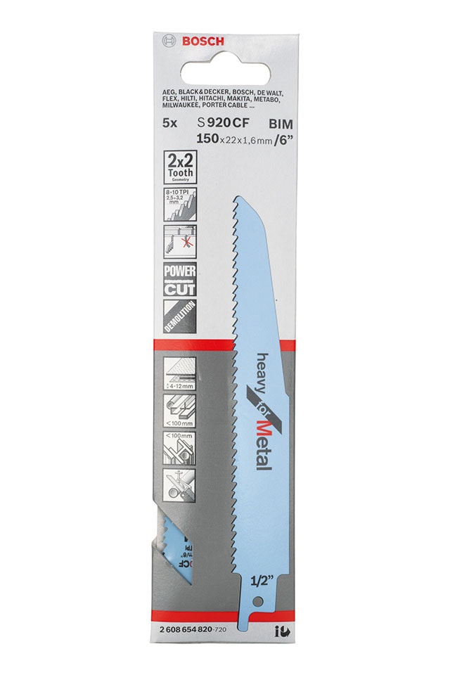 Den vide basen (22 mm) kombinert med ekstra tykt materiale (1,6 mm) gir den nødvendige stabiliteten for demolering av metall. I tillegg økes hastighet og bladlevetid i tykke materialer takket være patentert 2x2 tanngeometri med stor tannavstand. Bladet av BIM (bi-metall) er utformet for kutting av stålmaterialer med normal styrke ved demoleringsarbeid. Den store tannavstanden (2,5+3,2 mm) kan brukes på rør og profiler med en veggtykkelse på 4 mm til 12 mm. Det har standard lengde på 150 mm som gir en skjærekapasitet på opptil 100 mm. S 920 CF Heavy for Metal bajonettsagblad er perfekt for bruk med rørkutteutstyr. Til bruk sammen med bajonettsager med 1/2" universelle skaftsystemer.